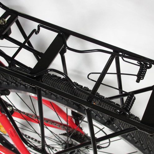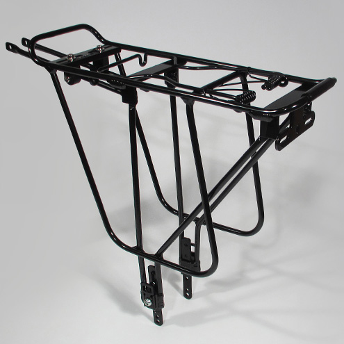 Прочный алюминиевый багажник для горных и дорожных велосипедов с зажимом на пружинах. Совместим только с ободными тормозами V-brake. Подходит для всех типов рам. Имеет широкие фронтальные рамки для поддержки боковых карманов велосипедных сумок типа "штаны".