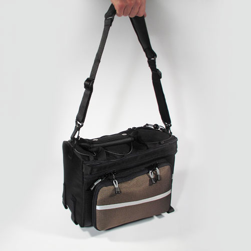 Велосумка на багажник с большими боковыми откидными карманами на ремнях и липучках. Имеет дополнительную молнию для увеличения объема по высоте. В модели сумки использован жесткий каркас и усиленные боковые панели под откидными карманами. Эластичный шнур для закрепления дополнительных вещей, съемный наплечный ремень.